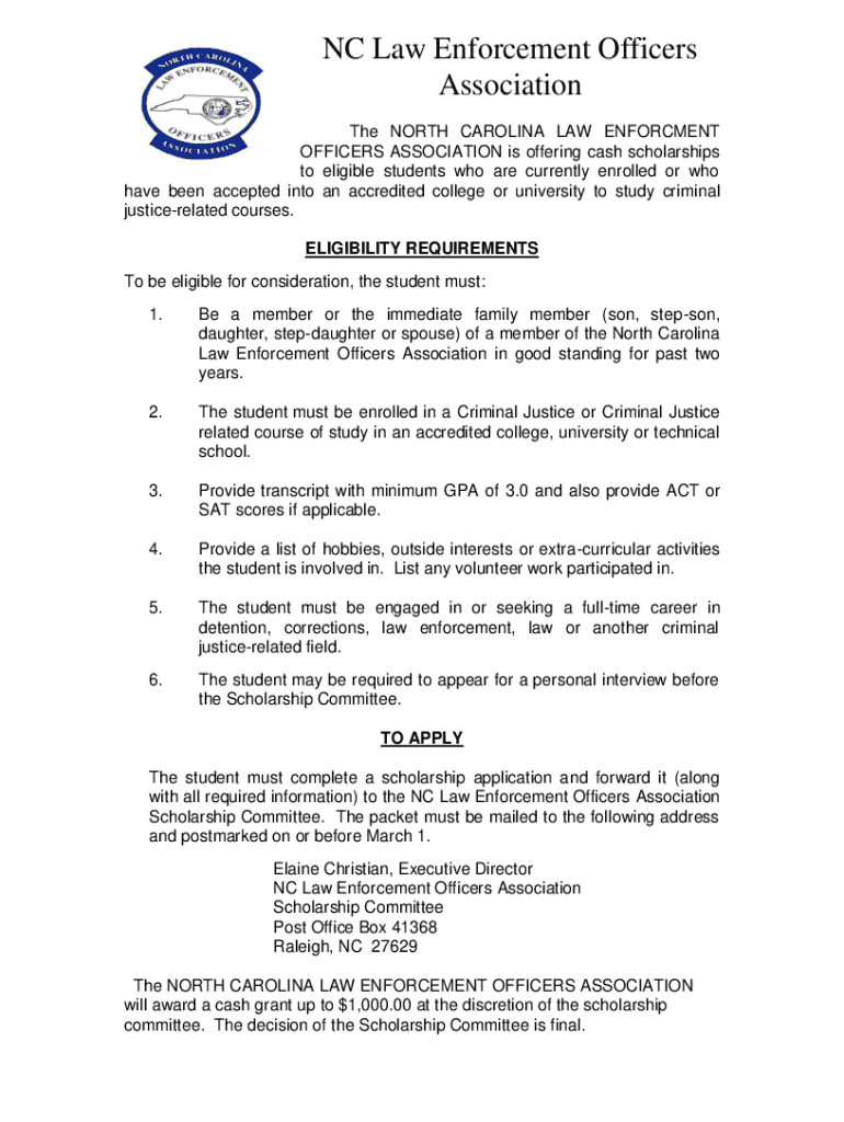 This document is an application for cash scholarships offered by the North Carolina Law Enforcement Officers Association to eligible students pursuing criminal justice-related studies. It outlines