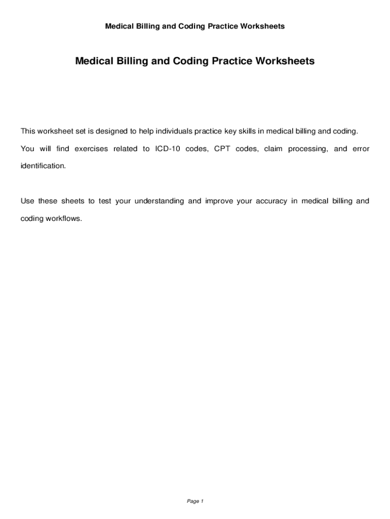 This worksheet set is designed to help individuals practice key skills in medical billing and coding, including exercises related to ICD-10 codes, CPT codes, claim processing, and error identification.