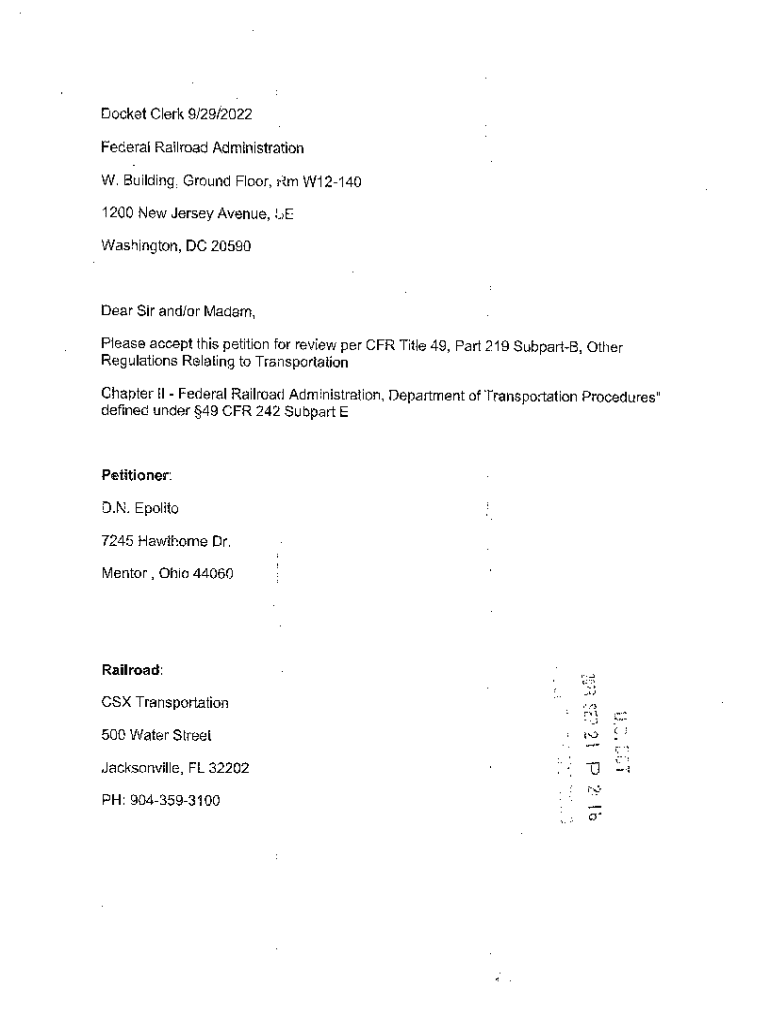 Docket Clerk 9/29/2022 Federal Railroad Administration W. Building, Ground Floor,m W121401200 New Jersey Avenue, LE Washington, DC 20590Dear Sir and/or Madam, Please accept this petition for review