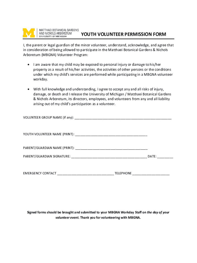 Youth volunteers who are under 18 years old need the permission form filled out by a parent or guardian.