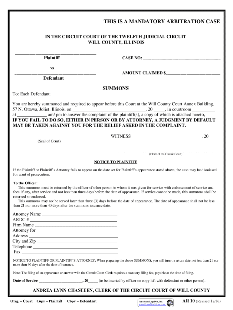 THIS IS A MANDATORY ARBITRATION CASE IN THE CIRCUIT COURT OF THE TWELFTH JUDICIAL CIRCUIT WILL COUNTY, ILLINOIS ___PlaintiffCASE NO: ___vs ___AMOUNT CLAIMED $___DefendantSUMMONS To: Each Defendant: