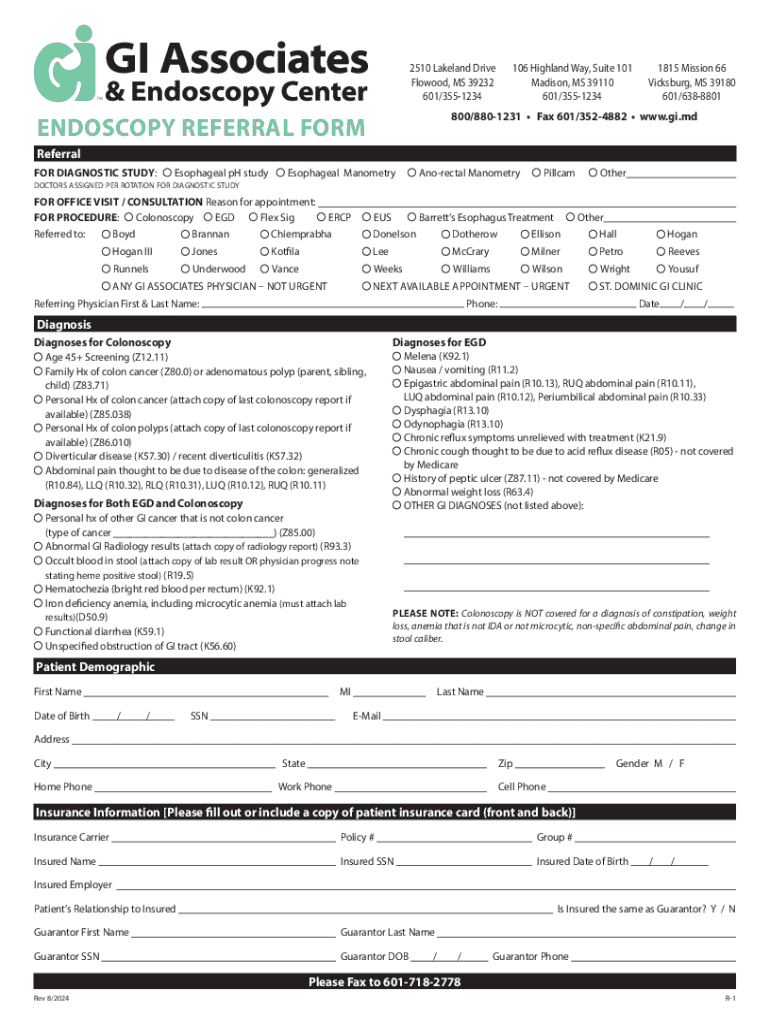 This form is used to refer patients for various endoscopy diagnostic studies and procedures, including colonoscopy and esophagogastroduodenoscopy (EGD). It captures patient demographics, referring