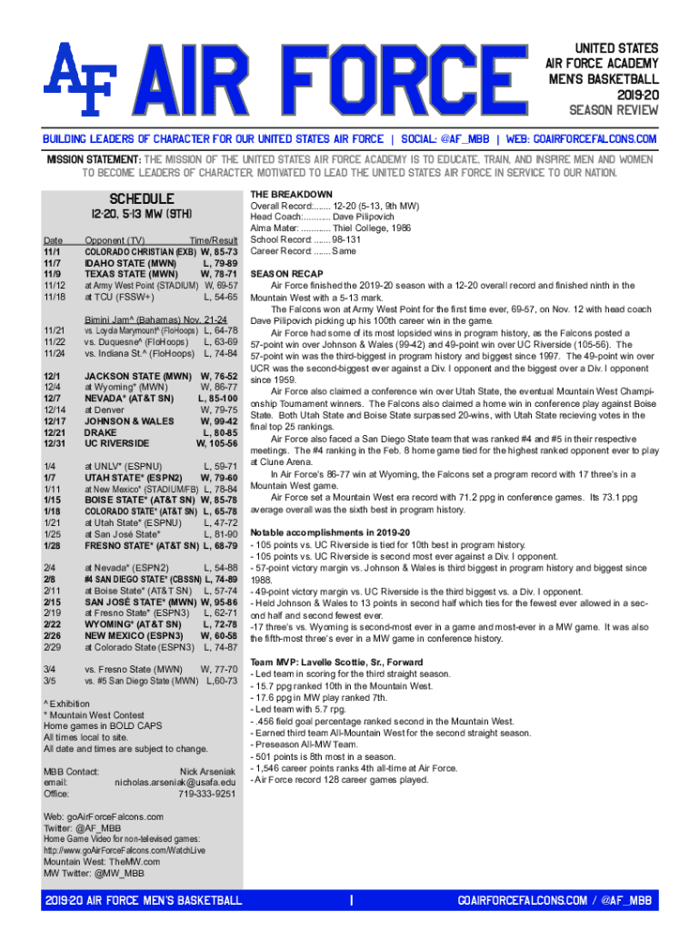 Air ForceUnited States Air Force Academy Mens Basketball 201920 Season ReviewBuilding leaders of character for our United States Air Force | SOCIAL: @AF_MBB | Web: goAirForceFalcons.com Mission Statement: