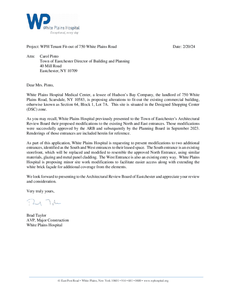 Application for alterations to fit-out the existing commercial building at 750 White Plains Road, Scarsdale, NY, to accommodate a new outpatient ambulatory care center. The proposed modifications