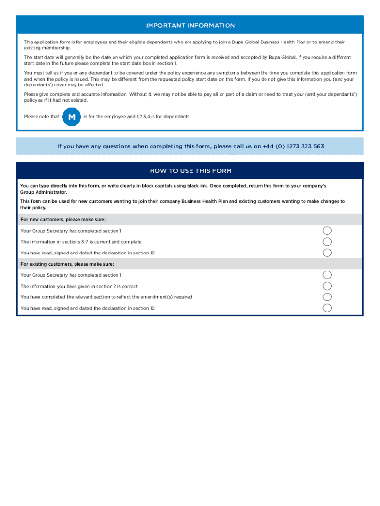 This application form is for employees and their eligible dependants applying to join a Bupa Global Business Health Plan or to amend their existing membership. It includes important information regarding