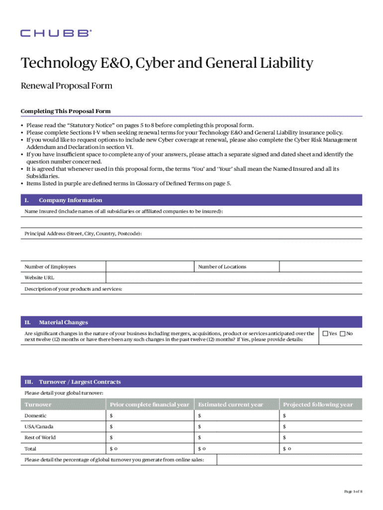 This proposal form is intended for the renewal of Technology Error & Omissions, Cyber, and General Liability insurance policies. It requires detailed disclosures about corporate structure, financial