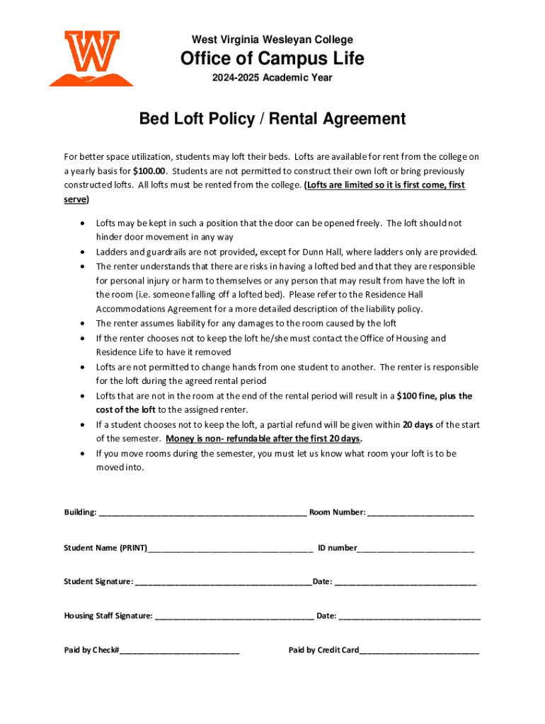 This document outlines the policies and rental agreement for bed lofts at West Virginia Wesleyan College, detailing responsibilities, conditions for rental, and financial obligations.