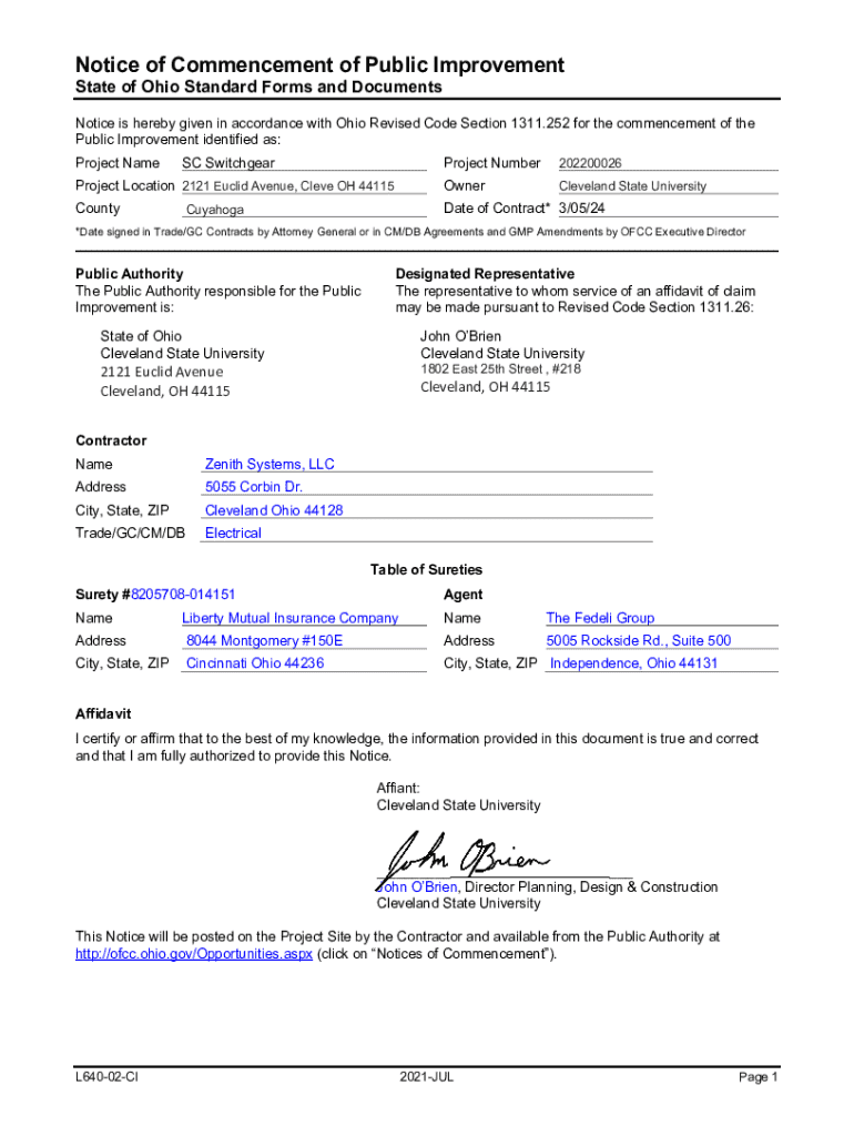 Notice is hereby given in accordance with Ohio Revised Code Section 1311.252 for the commencement of the Public Improvement identified as SC Switchgear, Project Number 202200026, at Cleveland State