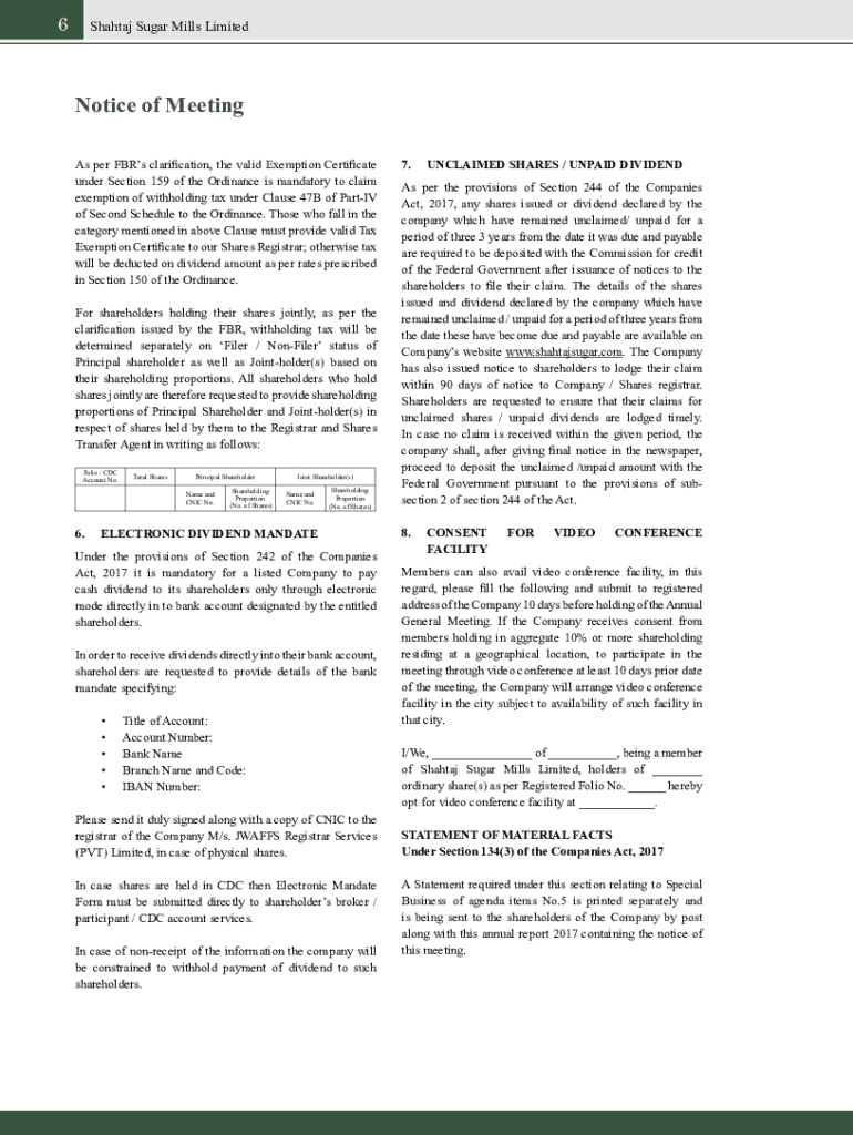 This document serves as a notice for the shareholders of Shahtaj Sugar Mills Limited, detailing the procedures for submitting Tax Exemption Certificates, Electronic Dividend Mandate, claims for unclaimed