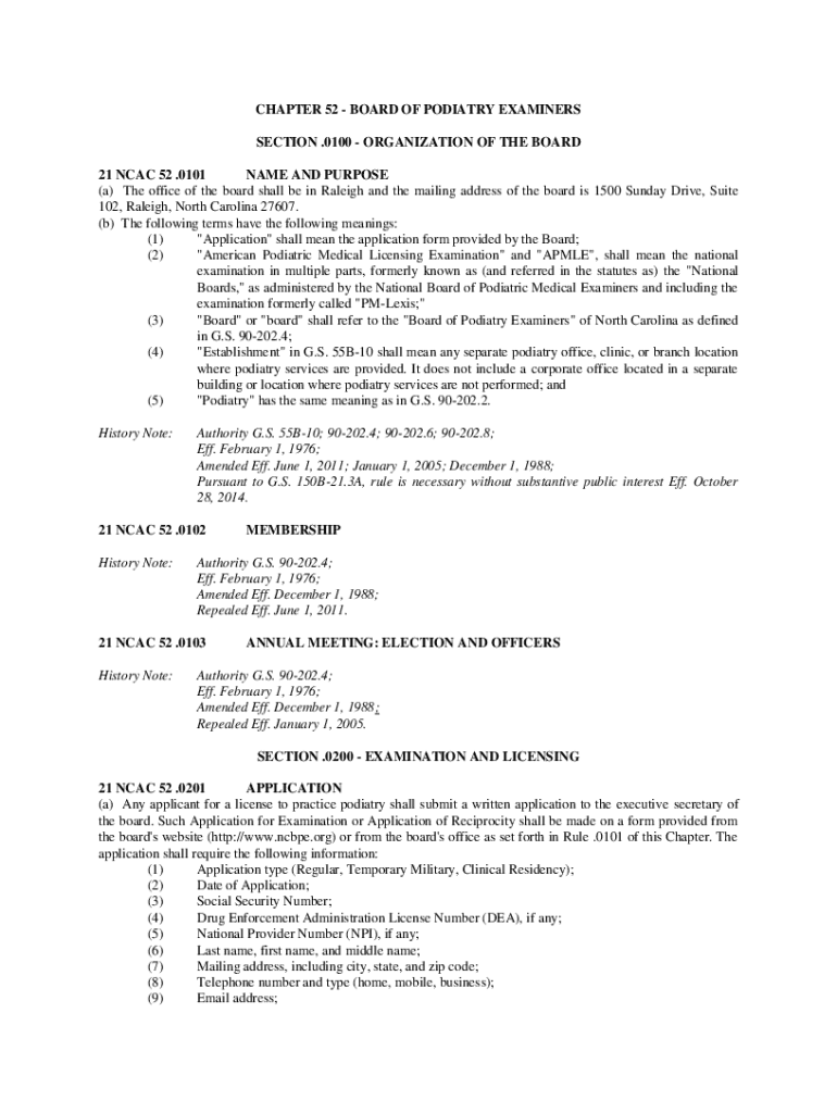 Obtain the North Carolina Podiatry Board's official regulation document.