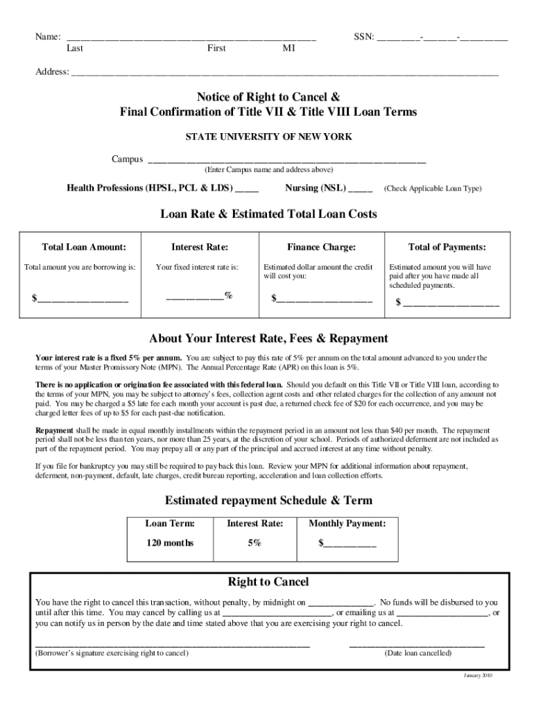Name: ___ Last First MISSN: _________Address: ___Notice of Right to Cancel & Final Confirmation of Title VII & Title VIII Loan Terms STATE UNIVERSITY OF NEW YORK Campus ___ (Enter Campus name and