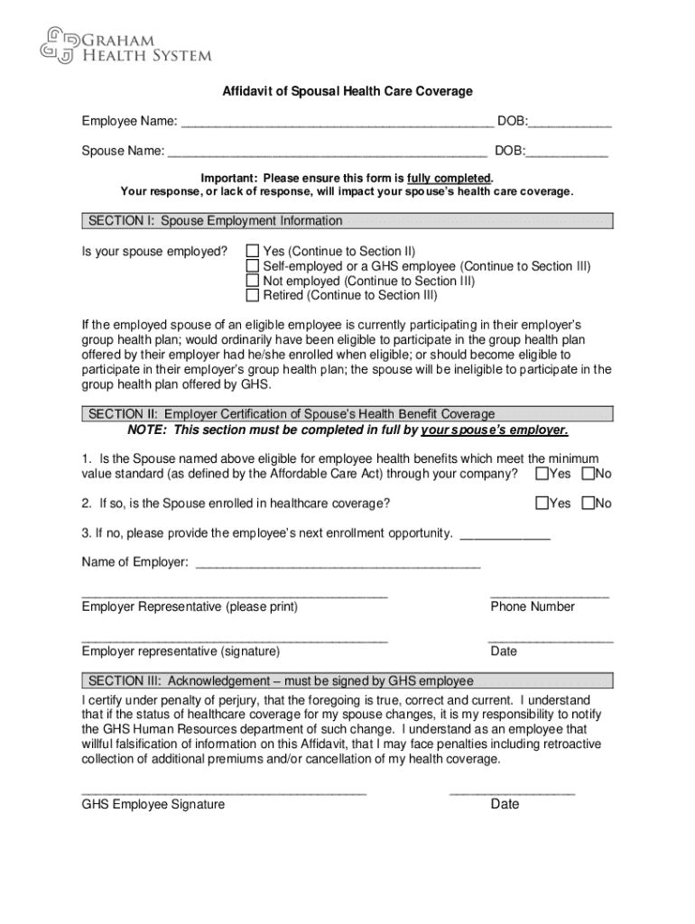 Get the free Affidavit of Spousal Health Care Coverage