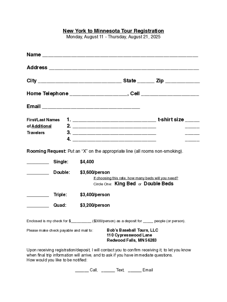 Registration form for a tour from New York to Minnesota scheduled from August 11 to August 21, 2025, including personal and payment information.