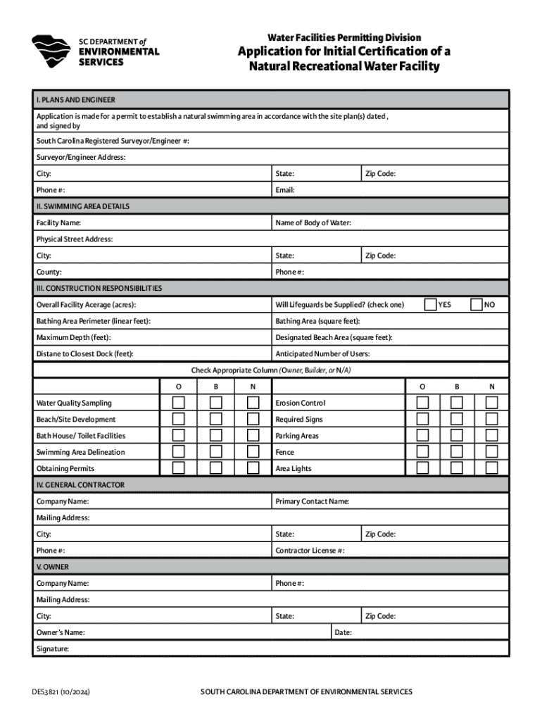 This form is used by contractors, engineers, or owners to apply for a permit to construct a natural recreational water facility, detailing plans, swimming area specifications, construction responsibilities,