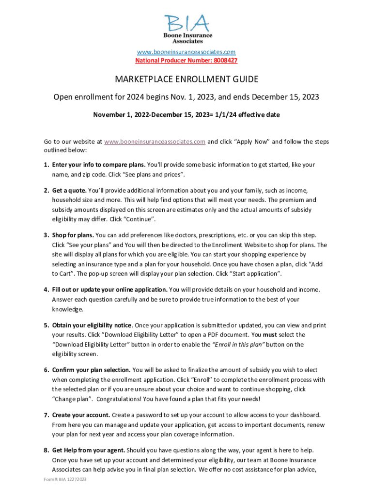 www.booneinsuranceasociates.com National Producer Number: 8008427MARKETPLACE ENROLLMENT GUIDE Open enrollment for 2024 begins Nov. 1, 2023, and ends December 15, 2023 November 1, 2022December 15,