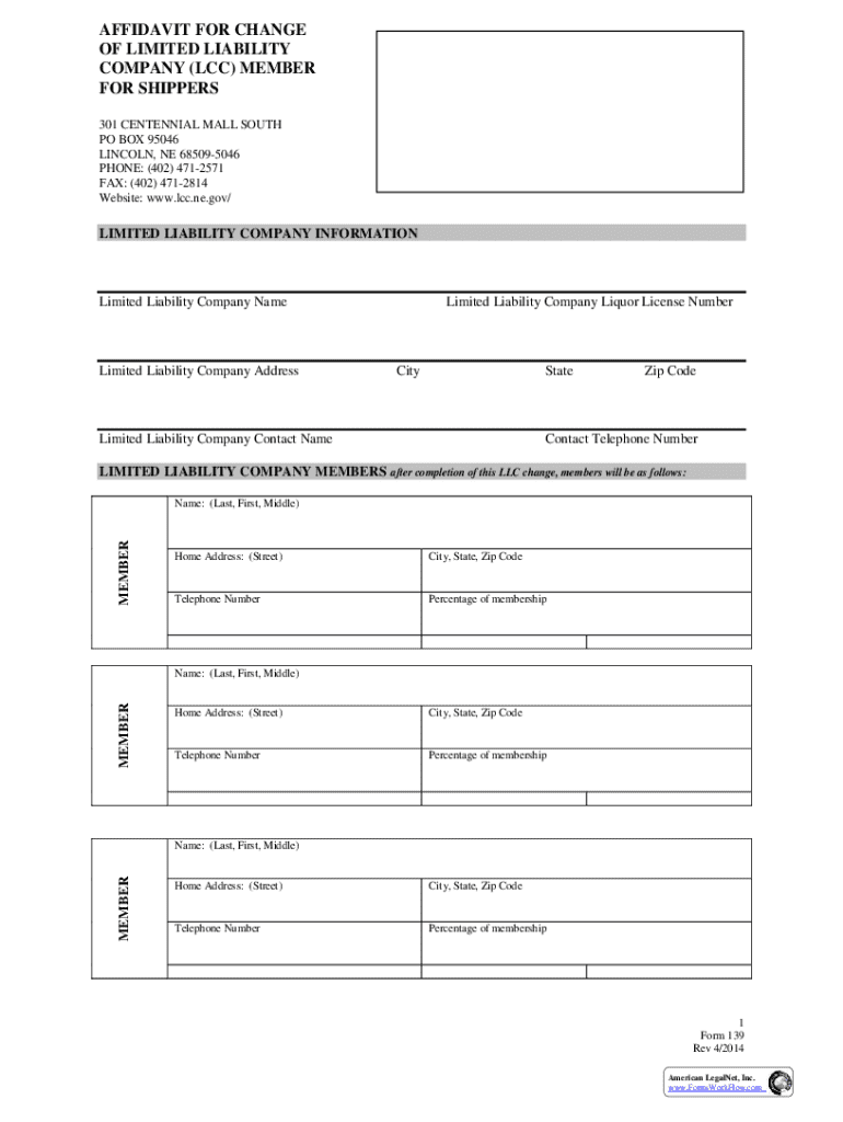 Get the free Affidavit for Change of Limited Liability Company (lcc) Member for Shippers