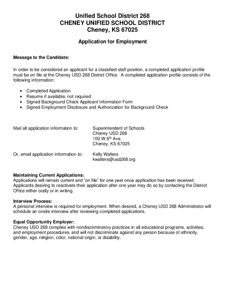 This document serves as an application for employment for classified staff positions within the Cheney Unified School District 268. It includes requirements for submission, personal information, employment