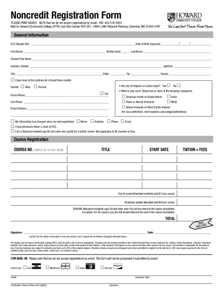 This form is used for registering for noncredit courses at Howard Community College. It requires personal information such as name, date of birth, address, and course details, and must be submitted