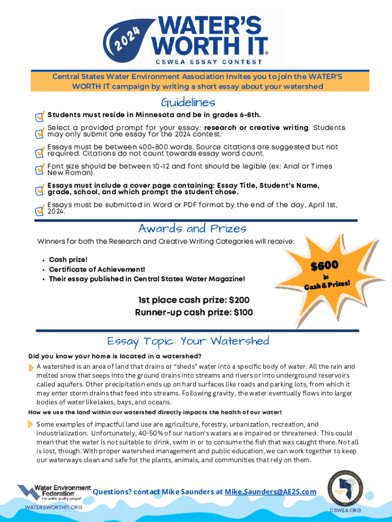 Central States Water Environment Association invites students in grades 6-8 from Minnesota to participate in the WATER\'S WORTH IT essay competition by writing a short essay about their watershed.
