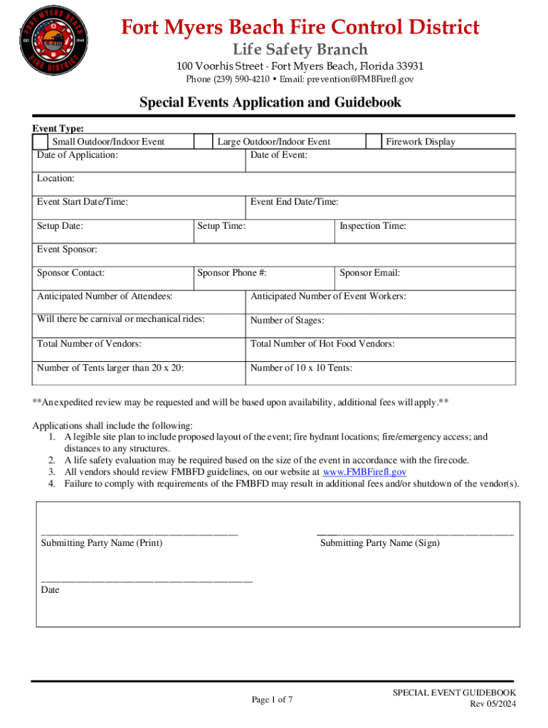 This guidebook establishes responsibilities for event promoters, sponsors, and vendors participating in events under the jurisdiction of the Fort Myers Beach Fire Control District. It outlines application