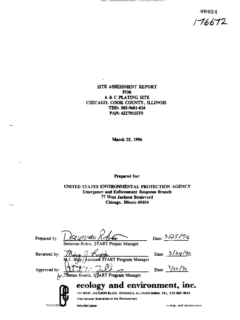 This document presents a comprehensive assessment of the A & C Plating site located in Chicago, including site history, description, analytical results, potential threats, and proposed removal actions