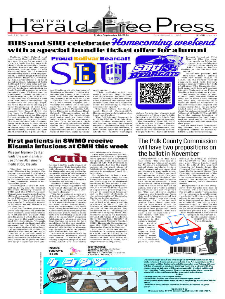 Friday, September 20, 2024Vo l. 1 5 2 N o. 6 7Established in 1868$1.50 plus taxBHS and SBU celebrate Homecoming weekend with a special bundle ticket offer for alumni Bolivar High School and Southwest