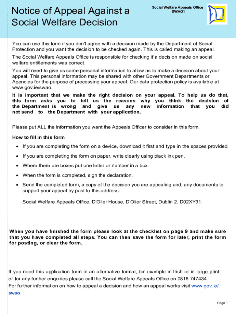 This form allows individuals to appeal a decision made by the Department of Social Protection regarding their social welfare entitlements. It requires personal information, reasons for the appeal,