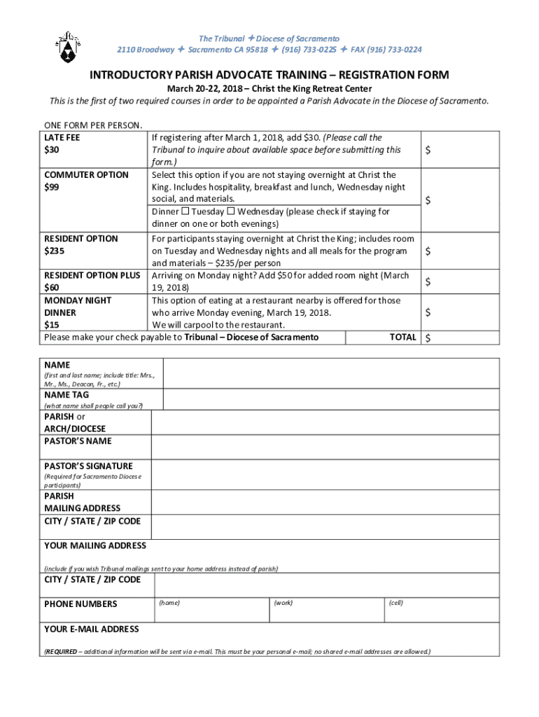Registration form for the Introductory Parish Advocate Training taking place from March 20-22, 2018, at Christ the King Retreat Center, Diocese of Sacramento. This form is required for individuals