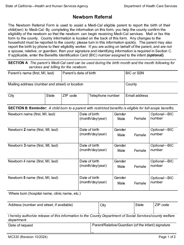 El formulario de referencia de recién nacidos se utiliza para ayudar a un padre elegible para Medi-Cal a informar el nacimiento de su(s) hijo(s) a Medi-Cal. Al completar la información en este formulario,