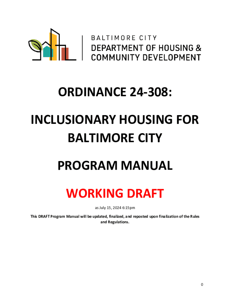 This working draft provides guidelines and requirements for property owners concerning the availability of Inclusionary Housing Units under Ordinance 24-308. The manual outlines processes from pre-development