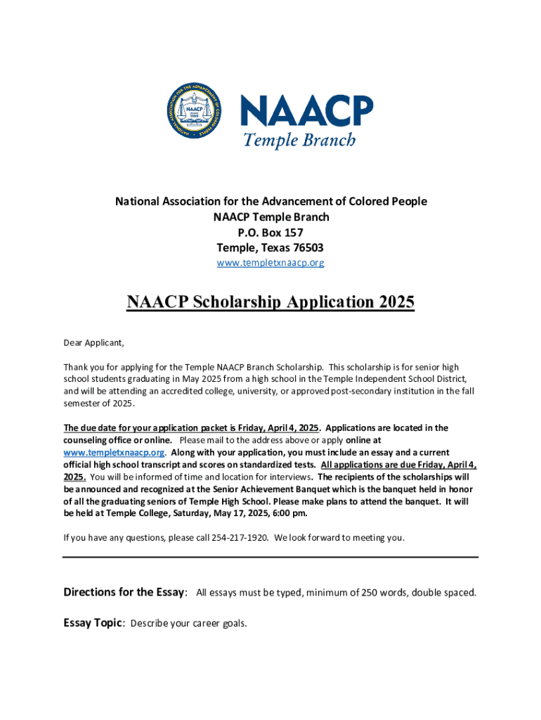 This is the application form for the Temple NAACP Branch Scholarship aimed at senior high school students graduating in May 2025, who are planning to attend an accredited college or university.