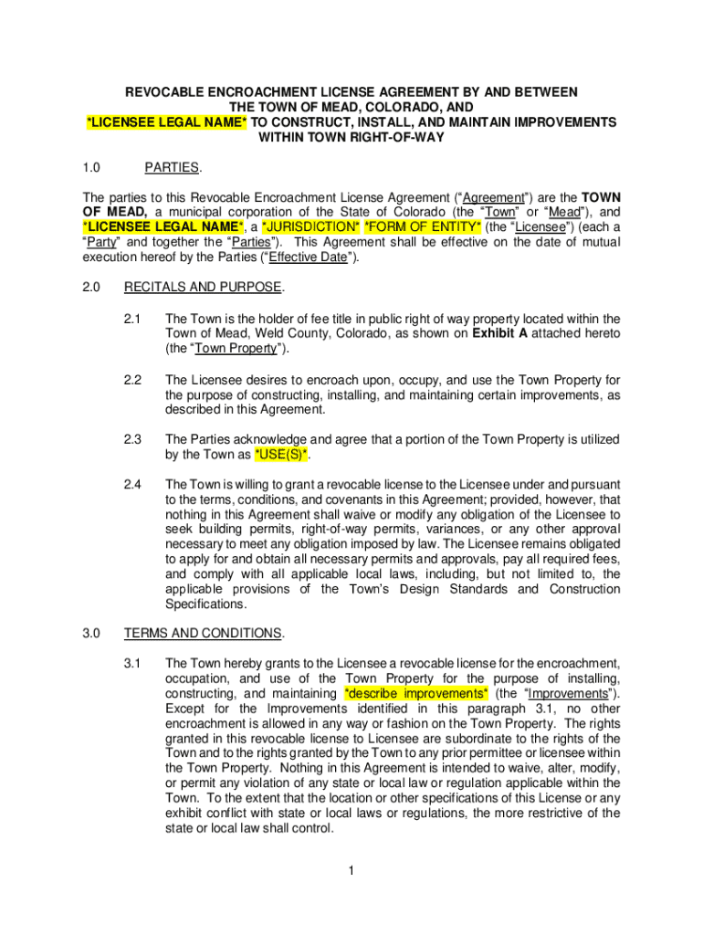 Este acuerdo establece los términos bajo los cuales el Licenciatario puede ocupar, utilizar y hacer mejoras en la propiedad pública del Ayuntamiento de Mead, Colorado. El Licenciatario debe obtener