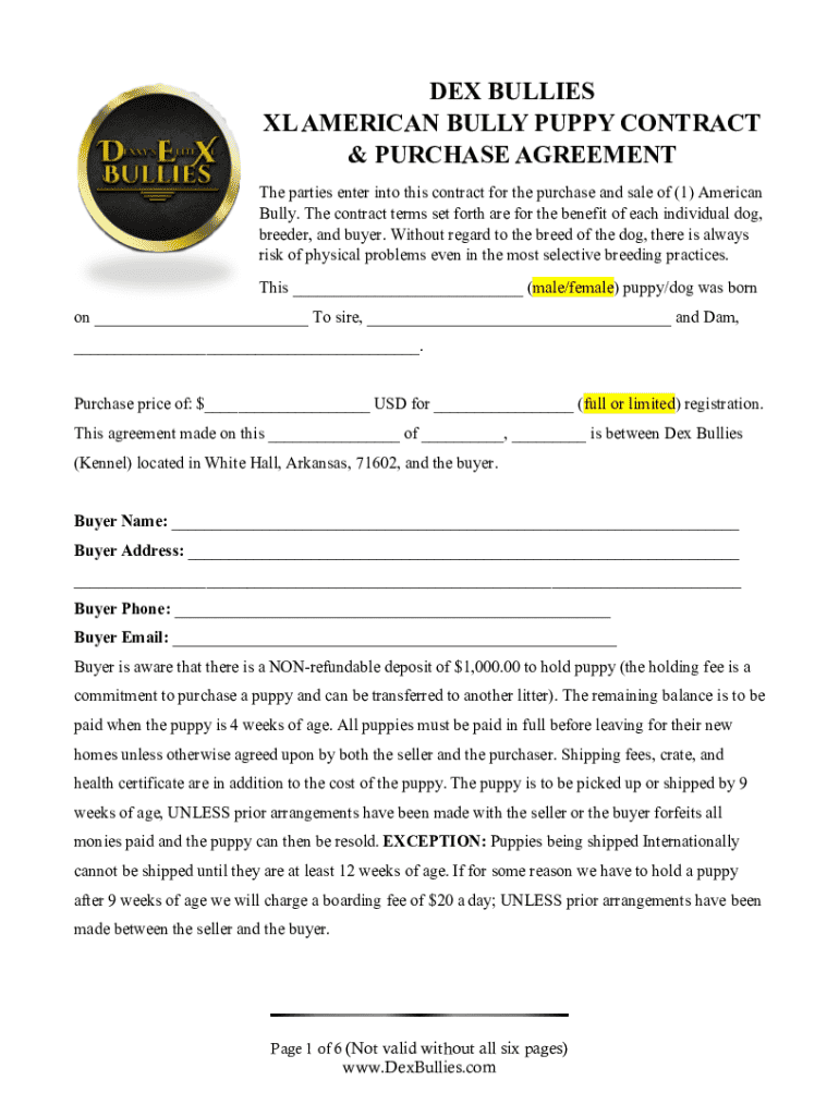 DEX BULLIES XL AMERICAN BULLY PUPPY CONTRACT & PURCHASE AGREEMENT The parties enter into this contract for the purchase and sale of (1) American Bully. The contract terms set forth are for the benefit