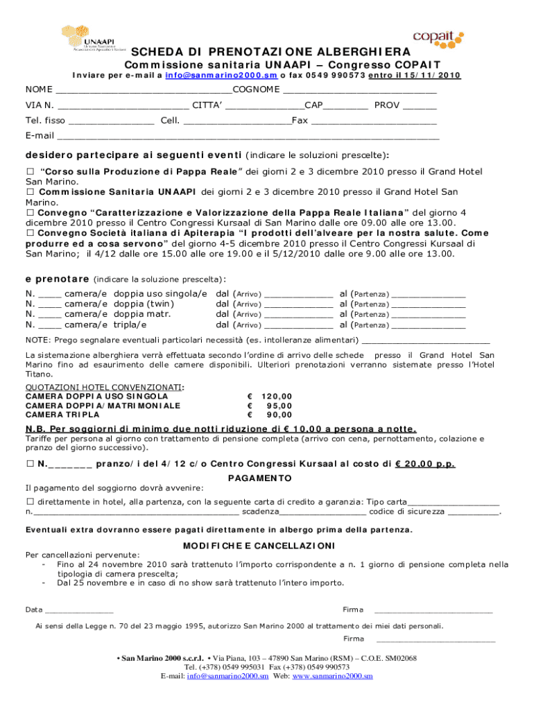 Modulo di prenotazione alberghiera per partecipanti al Congresso COPAIT, con dettagli sugli eventi, sistemazione e informazioni di pagamento.