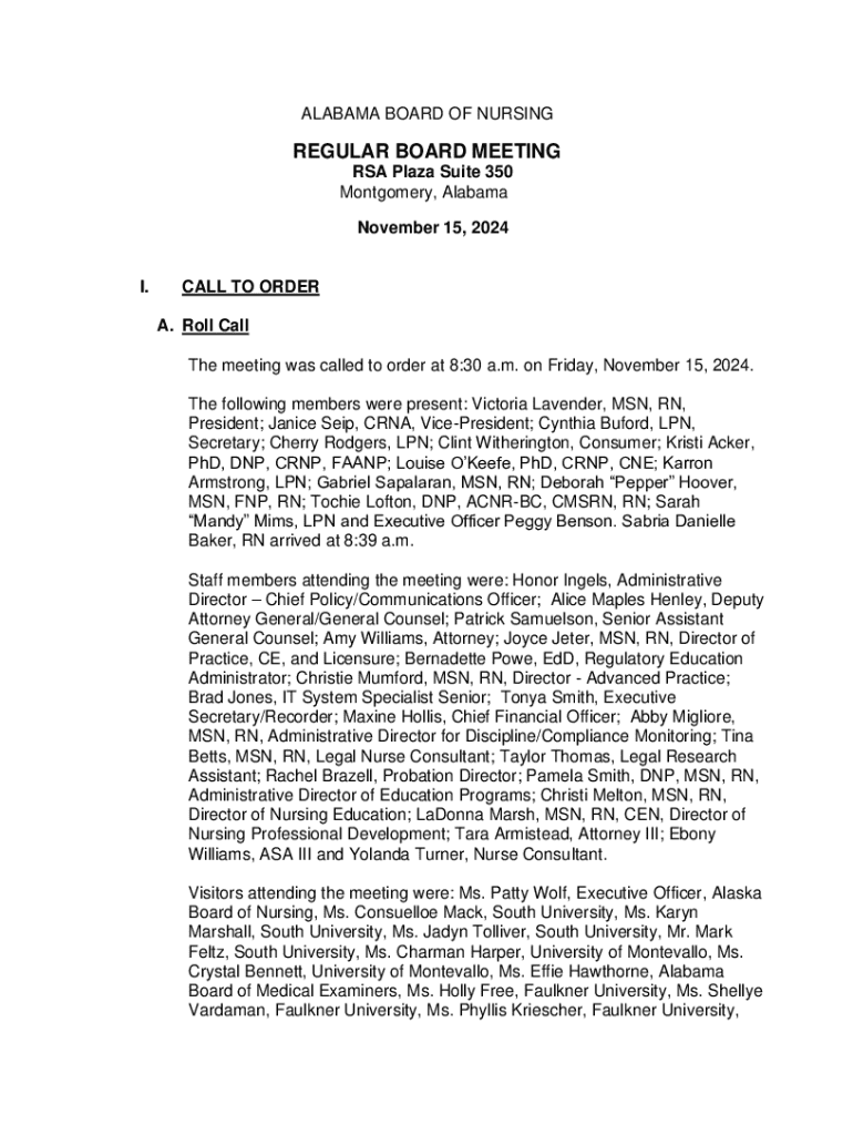 Get the free Alabama Board of Nursing Regular Board Meeting