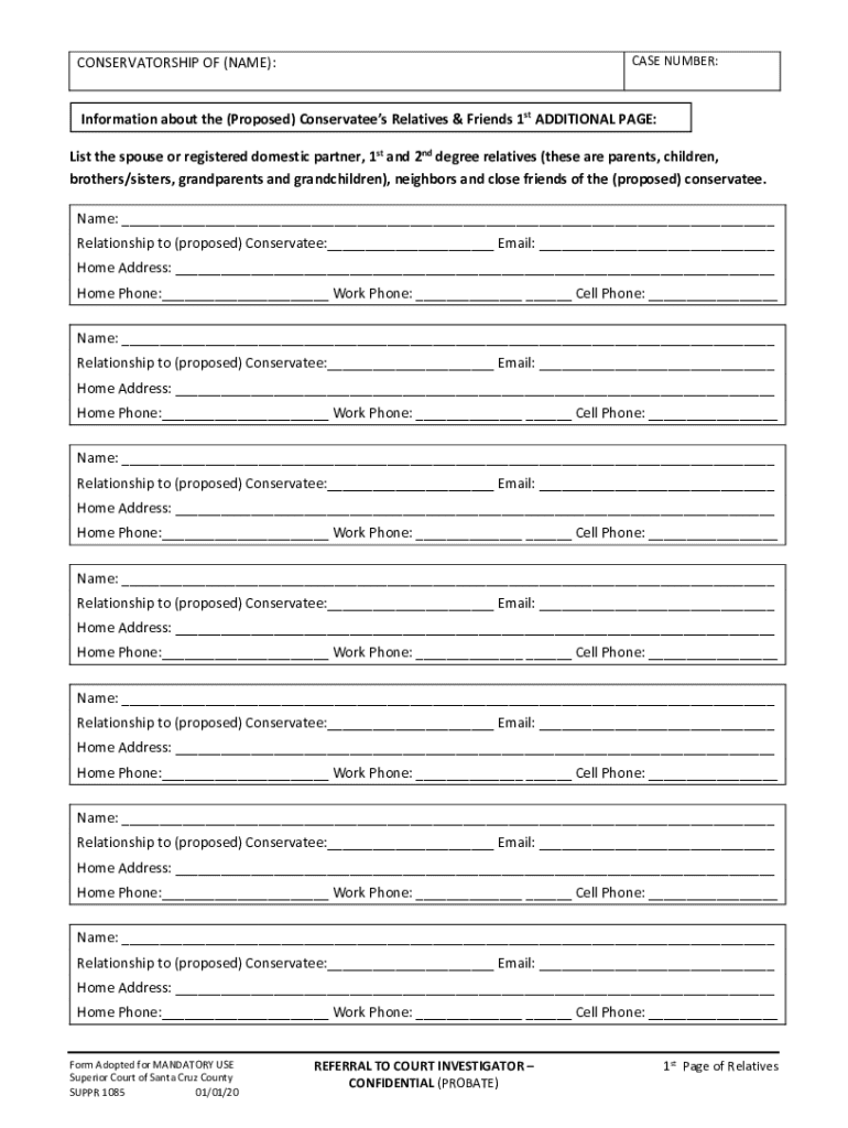 This document serves as an additional page to provide information about the proposed conservatee’s relatives and friends. It includes sections to list the spouse or registered domestic partner,