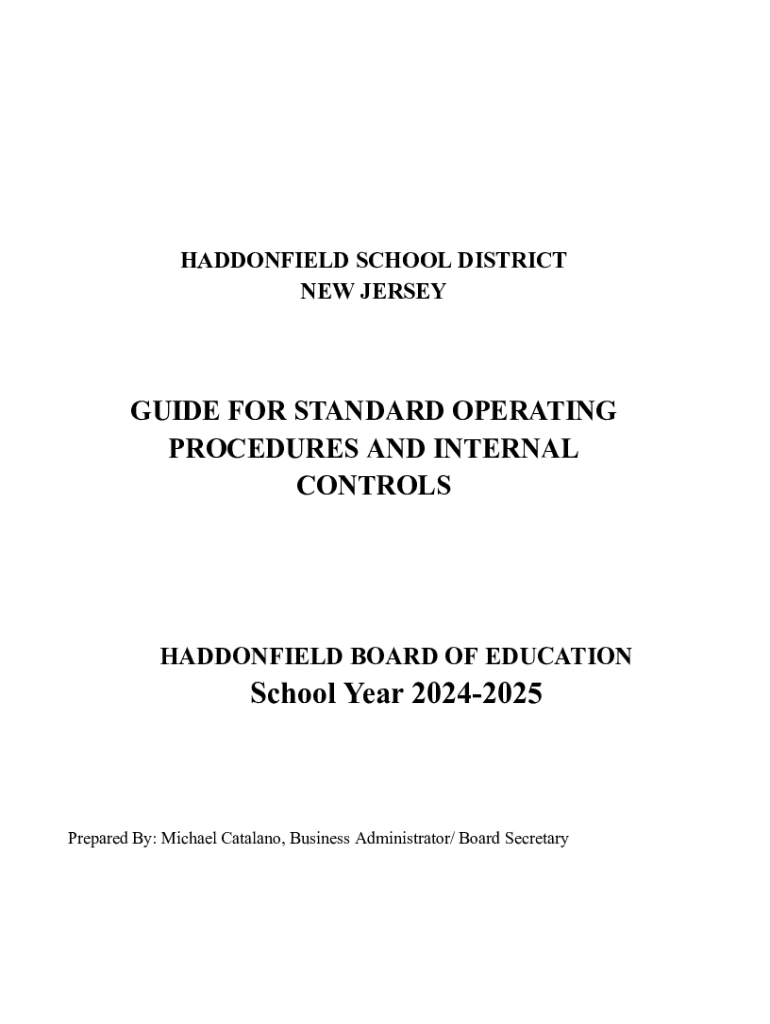 This document outlines the business practices approved by the Haddonfield Board of Education and maintained by the Business Office, focusing on internal controls, accounting procedures, cash management,