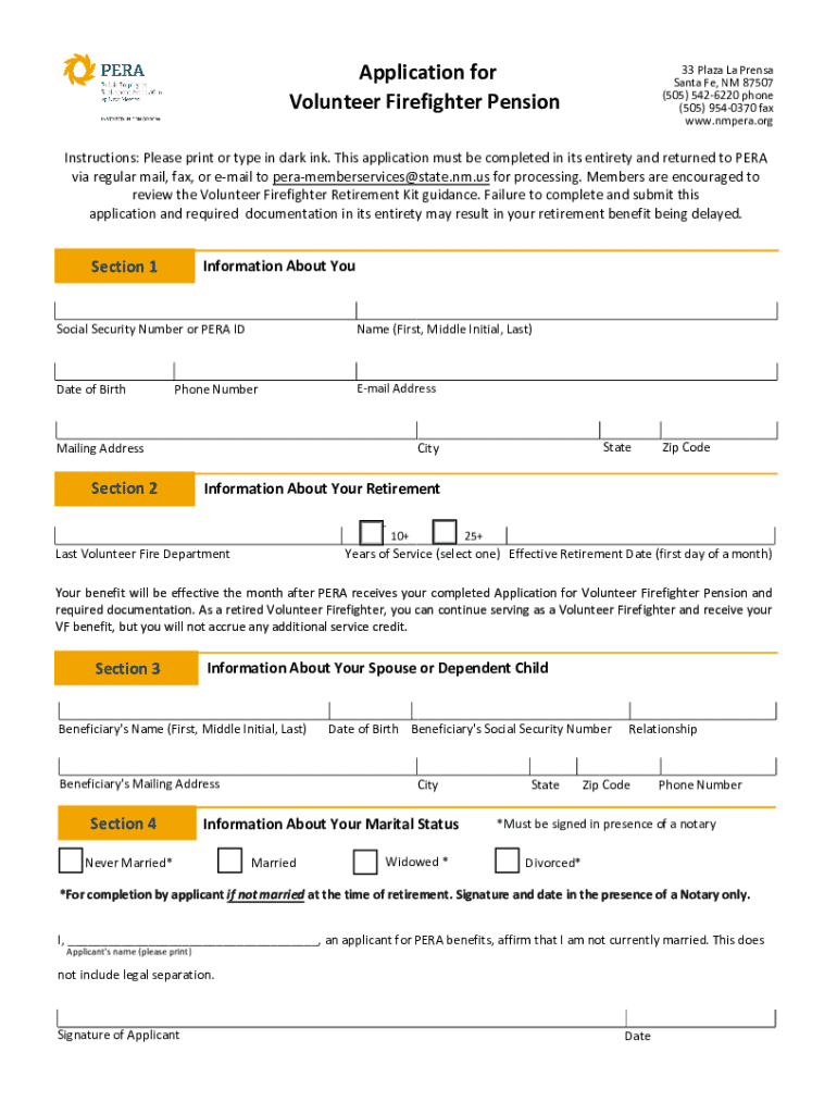 This application is required for volunteer firefighters seeking retirement benefits. It includes instructions on submitting the application, necessary documentation, and information about the retiree