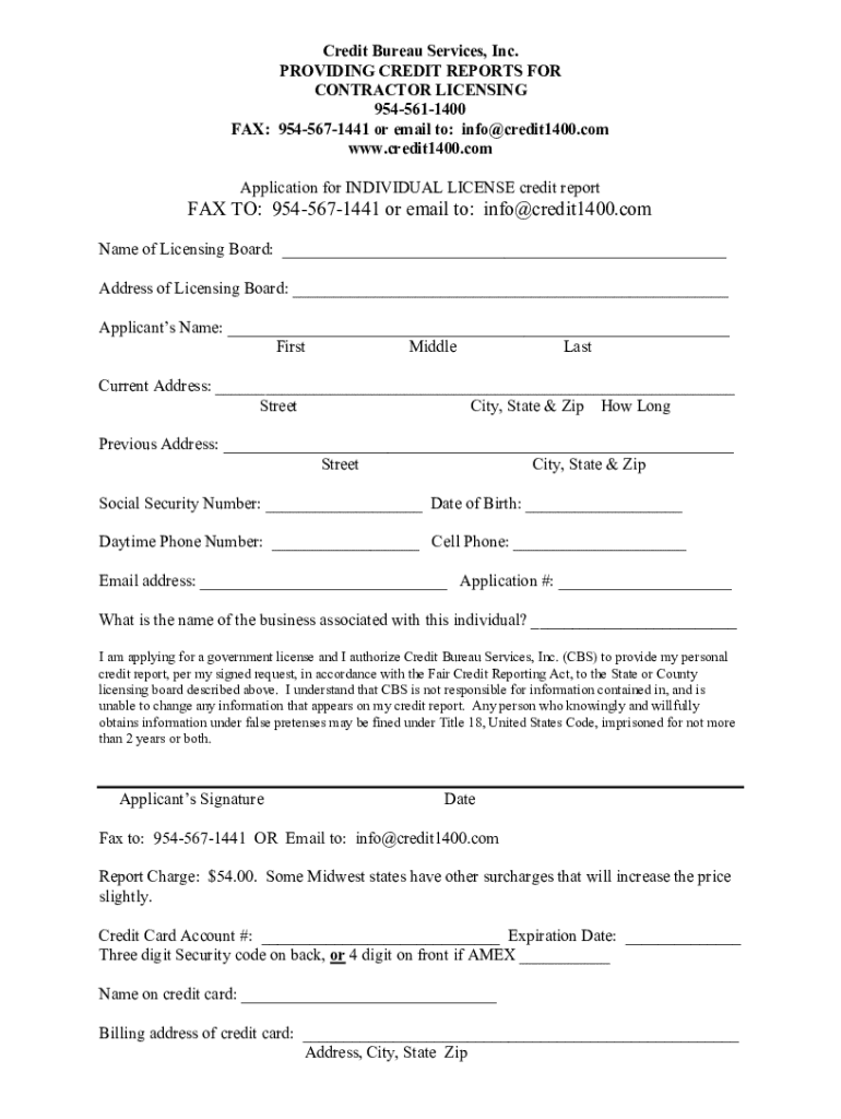 This document is an application form for obtaining a personal credit report from Credit Bureau Services, Inc. for contractor licensing purposes. It includes fields for personal information, contact