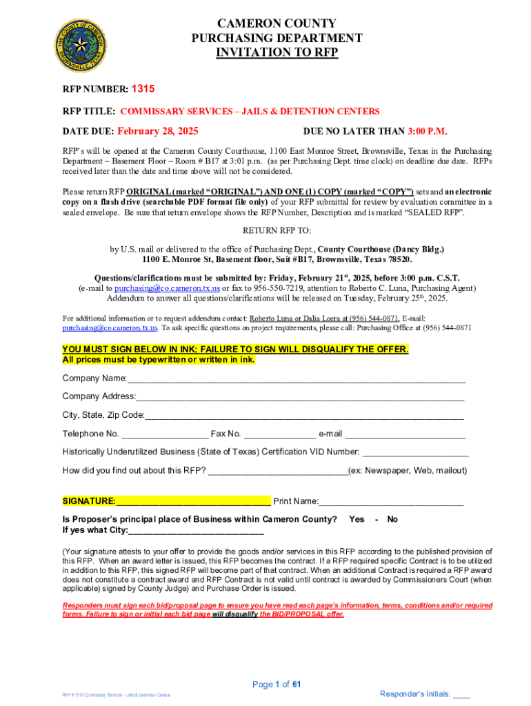 Cameron County is soliciting proposals for Commissary Services at its jails and detention centers. This RFP outlines the requirements, submission instructions, deadlines, and evaluation criteria for