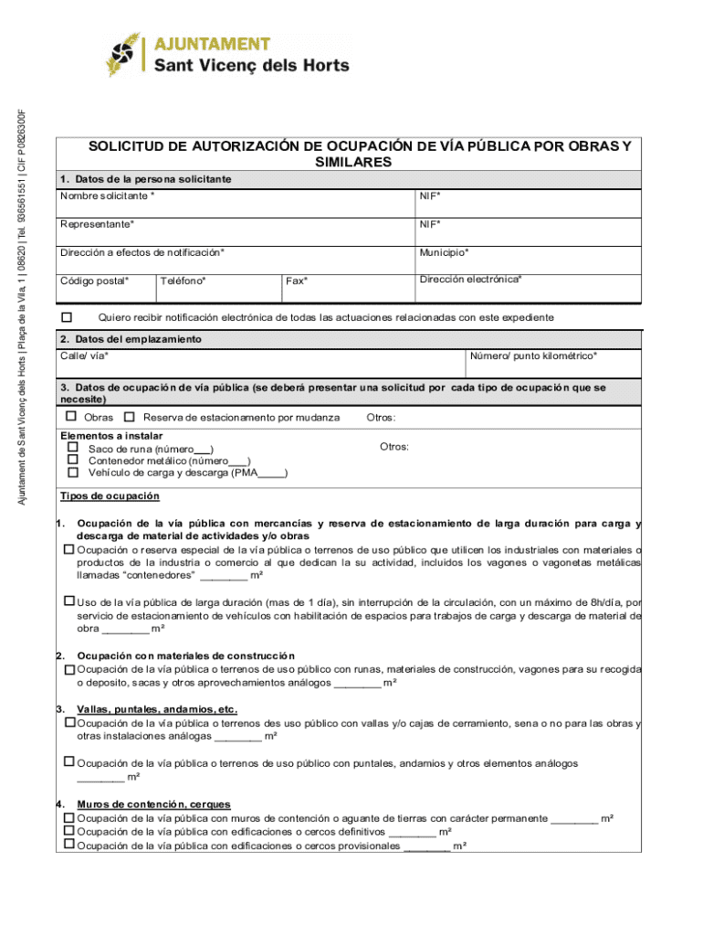Este formulario permite solicitar la autorización para la ocupación de la vía pública debido a obras y otras actividades relacionadas. Incluye secciones para datos del solicitante, emplazamiento,