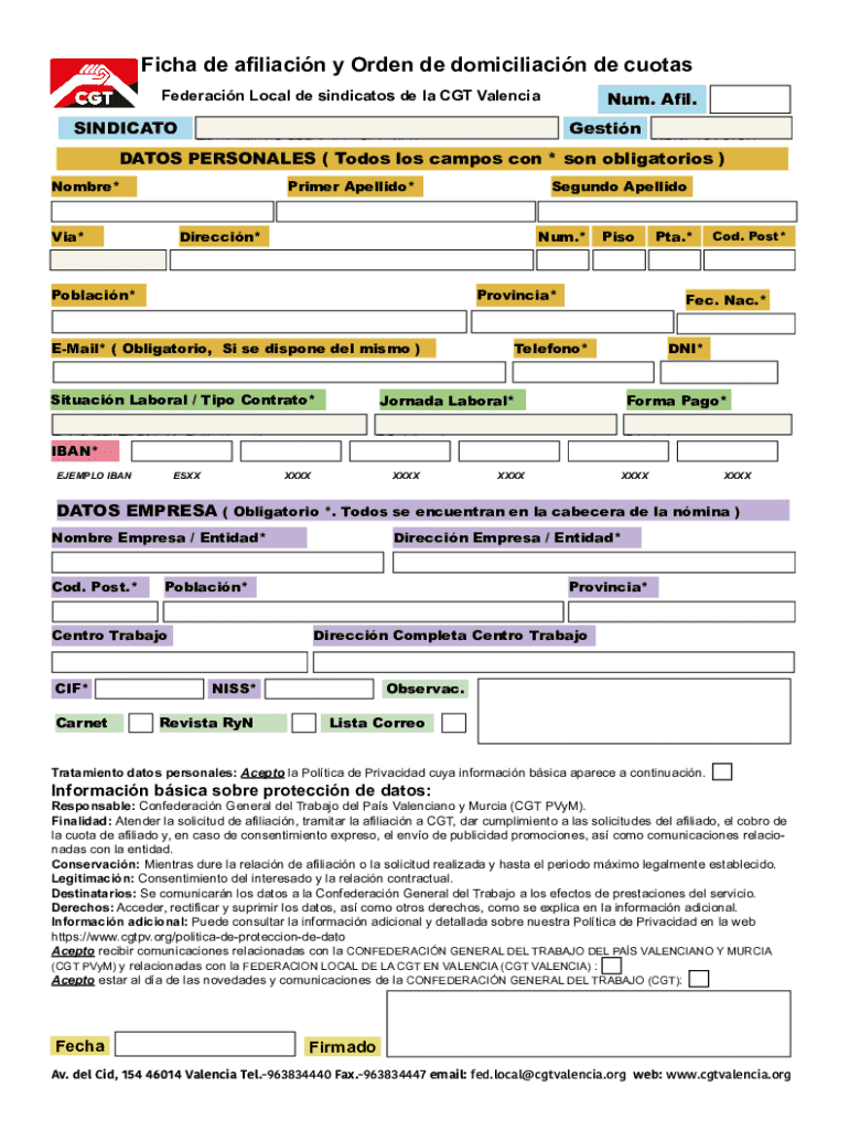 Este documento es una ficha de afiliación y orden de domiciliación para afiliados a la Federación Local de sindicatos de la CGT en Valencia. Contiene campos obligatorios para datos personales,