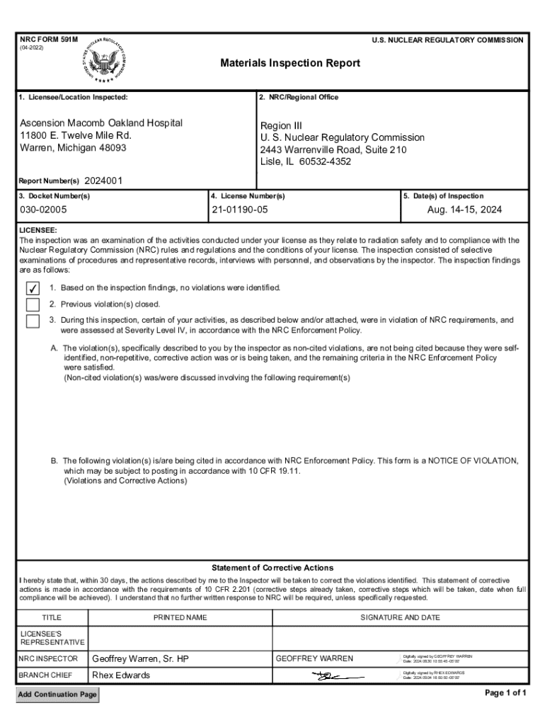 Este informe documenta la inspección llevada a cabo en Ascension Macomb Oakland Hospital en relación con la seguridad radiológica y el cumplimiento de las regulaciones del NRC. Se confirma que