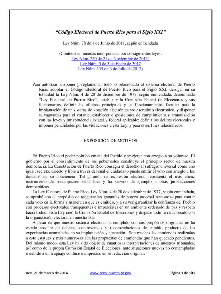 Este documento trata sobre la Ley Núm. 78 de 1 de junio de 2011, que establece el Código Electoral de Puerto Rico para el siglo XXI, autoriza y regula el sistema electoral, define los delitos electorales