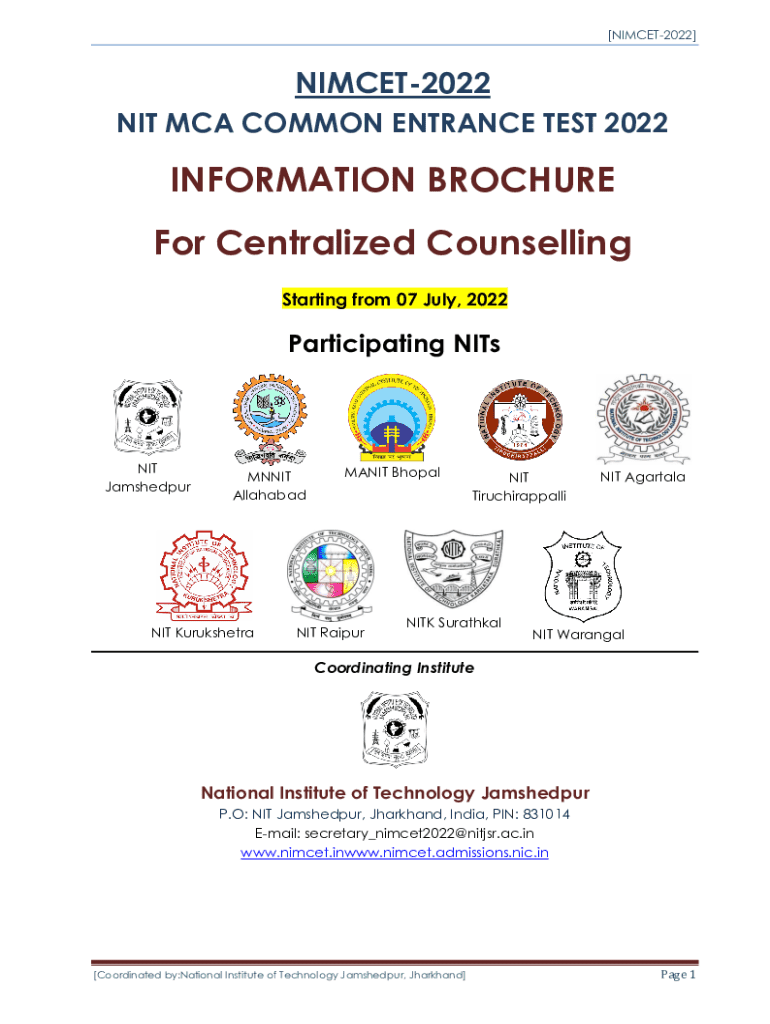 The NIMCET-2022 Information Brochure is a document that provides detailed information about the NIMCET (NIT Master of Computer Applications Entrance Test) including exam pattern, eligibility criteria, syllabus, and other important instructions for candidates.