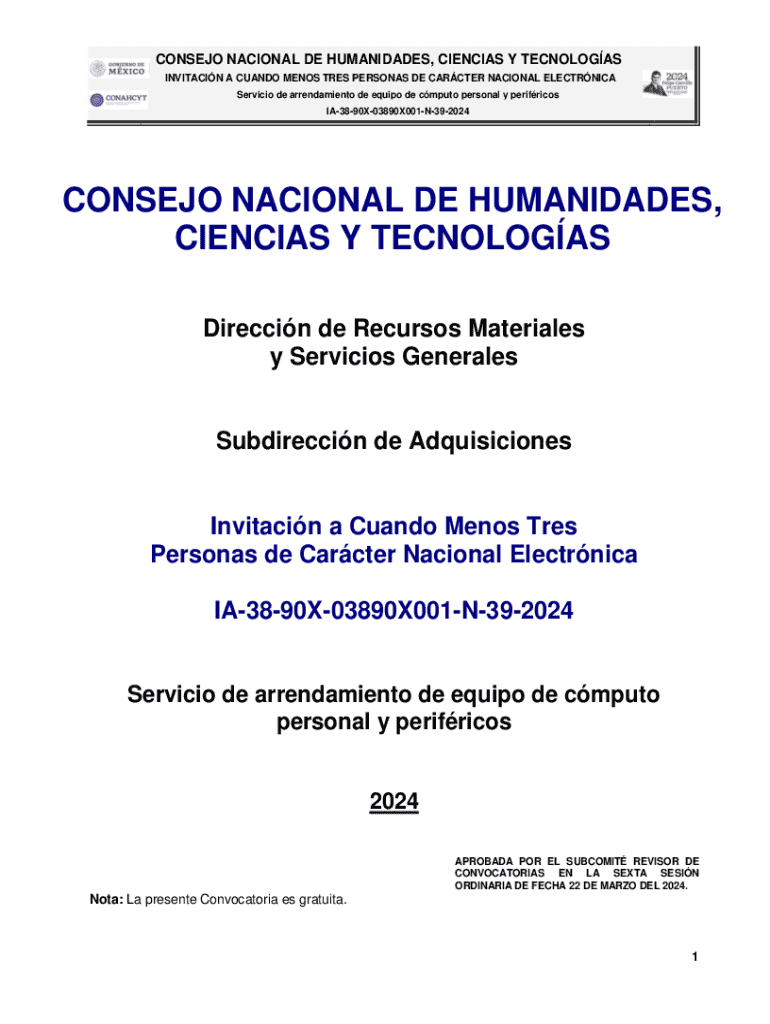 Convocatoria del Consejo Nacional de Humanidades, Ciencias y Tecnologías para la contratación del servicio de arrendamiento de equipos de cómputo personal y periféricos, mediante el proceso de