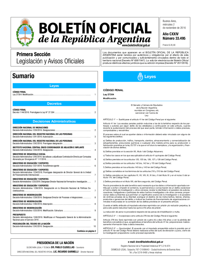 Primera SeccinBuenos Aires, mircoles 2 de noviembre de 2016Ao CXXIV Nmero 33.495 Precio $ 20,00 Los documentos que aparecen en el BOLETN OFICIAL DE LA REPBLICA ARGENTINA sern tenidos por autnticos