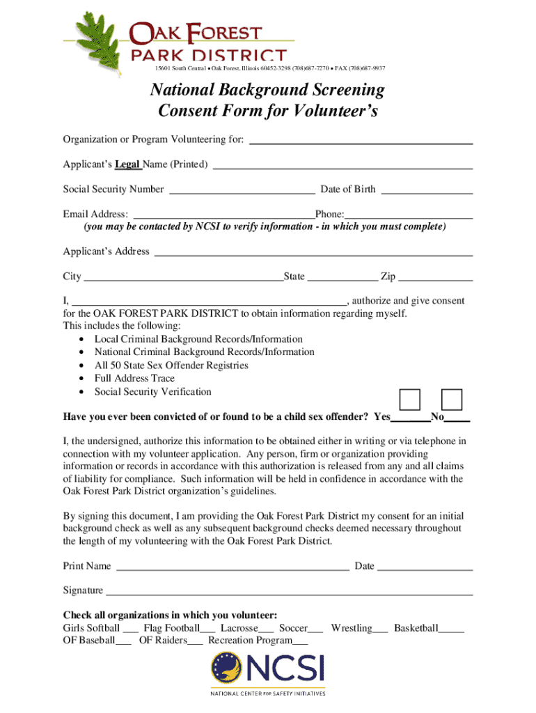 This form authorizes the Oak Forest Park District to obtain personal background information for individuals applying to volunteer. It includes consent for checking local and national criminal background