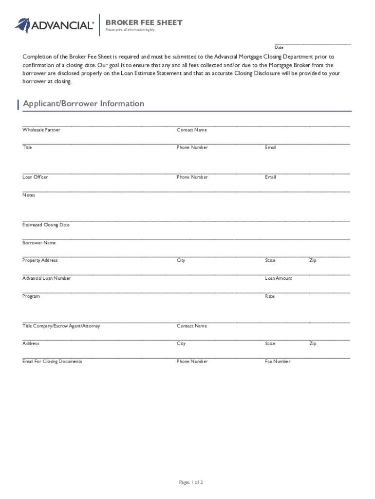 The Broker Fee Sheet is required for submission to the Advancial Mortgage Closing Department to ensure that all fees related to the Mortgage Broker from the borrower are accurately disclosed on the