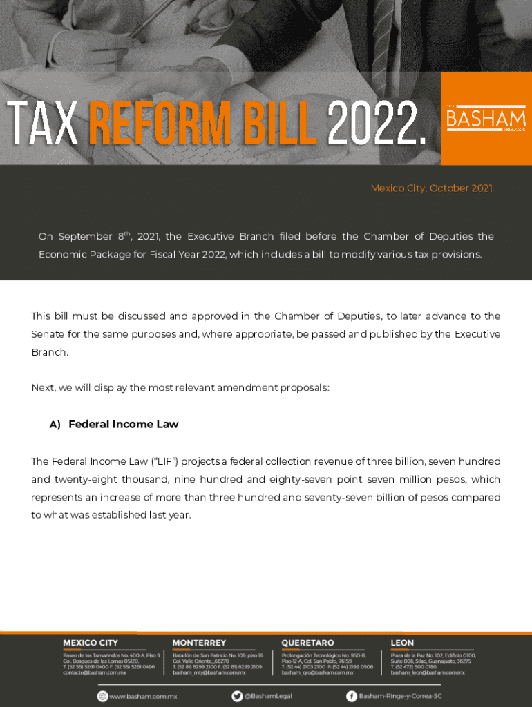 Mexico City, October 2021.On September 8th, 2021, the Executive Branch filed before the Chamber of Deputies the Economic Package for Fiscal Year 2022, which includes a bill to modify various tax provisions.This